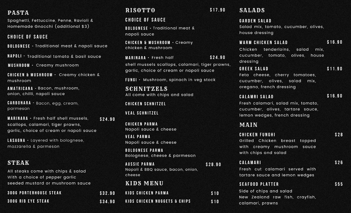 Beyond pizza, the kitchen shows its versatility with hearty pasta dishes like BOLOGNESE, NAPOLI, MUSHROOM, CHICKEN & MUSHROOM, and AMATRICANA, alongside comforting risottos including BOLOGNESE, CHICKEN & MUSHROOM, MARINARA, and FUNGI. For those craving something more substantial, the schnitzel lineup-CHICKEN SCHNITZEL, VEAL SCHNITZEL, CHICKEN PARMA, VEAL PARMA, and BOLOGNESE PARMA-adds a satisfying, pub-style touch to the menu. Lighter options are also well represented through GARDEN SALAD, WARM CHICKEN SALAD, GREEK SALAD, and CALAMARI SALAD, while the mains such as CHICKEN FUNGHI, CALAMARI, and SEAFOOD PLATTER cater to diners looking for variety beyond Italian staples.