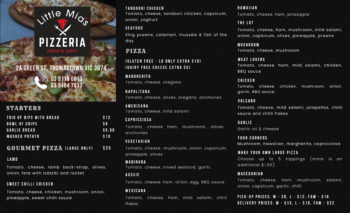 From a reviewer’s perspective, the menu at Little Mia's Pizzeria feels like a well-rounded celebration of classic Italian-Australian comfort food, offering something satisfying for every type of diner. The experience begins with approachable starters such as TRIO OF DIPS WITH BREAD, BOWL OF CHIPS, GARLIC BREAD, and MASHED POTATO, which set a casual and welcoming tone. Pizza is clearly the heart of the menu, ranging from indulgent GOURMET PIZZA (LARGE ONLY) options like LAMB, SWEET CHILLI CHICKEN, TANDOORI CHICKEN, and SEAFOOD, to reliable crowd-pleasers in the standard pizza range. The value-focused PIZZA (pick-up: M: $9, L: $12, FAM: $16) selection includes classics such as MARGHERITA, NAPOLITANA, AMERICANA, CAPRICCIOSA, and VEGETARIAN, making it easy for families and groups to order without stretching the budget.